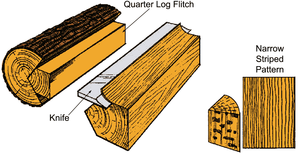 Quarter slicing simulates the same grain pattern as quartersawn solid lumber. A quarter log, or flitch, is mounted so the slicer cuts the log at a 45° angle to the axis lines of the log. This creates a striped, mostly straight grain effect. The Medullary Rays that are naturally very pronounced in White Oak or Red Oak logs will become a prominent visual characteristic of quartersawn veneers often referred to as "flakes" or "flecking".